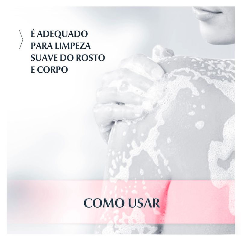 A embalagem do produto é segurada por uma mão. Ao lado, ícones em fundos vermelhos representam uso, família e pele sensível.